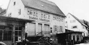 Das erste Geschäftshaus mit mechanischer Werkstätte (1928) in der Kirchstrasse 22, Sulz am Eck. Im Gebäude befand sich zudem der Gemischtwarenladen von Emilie Schechinger.